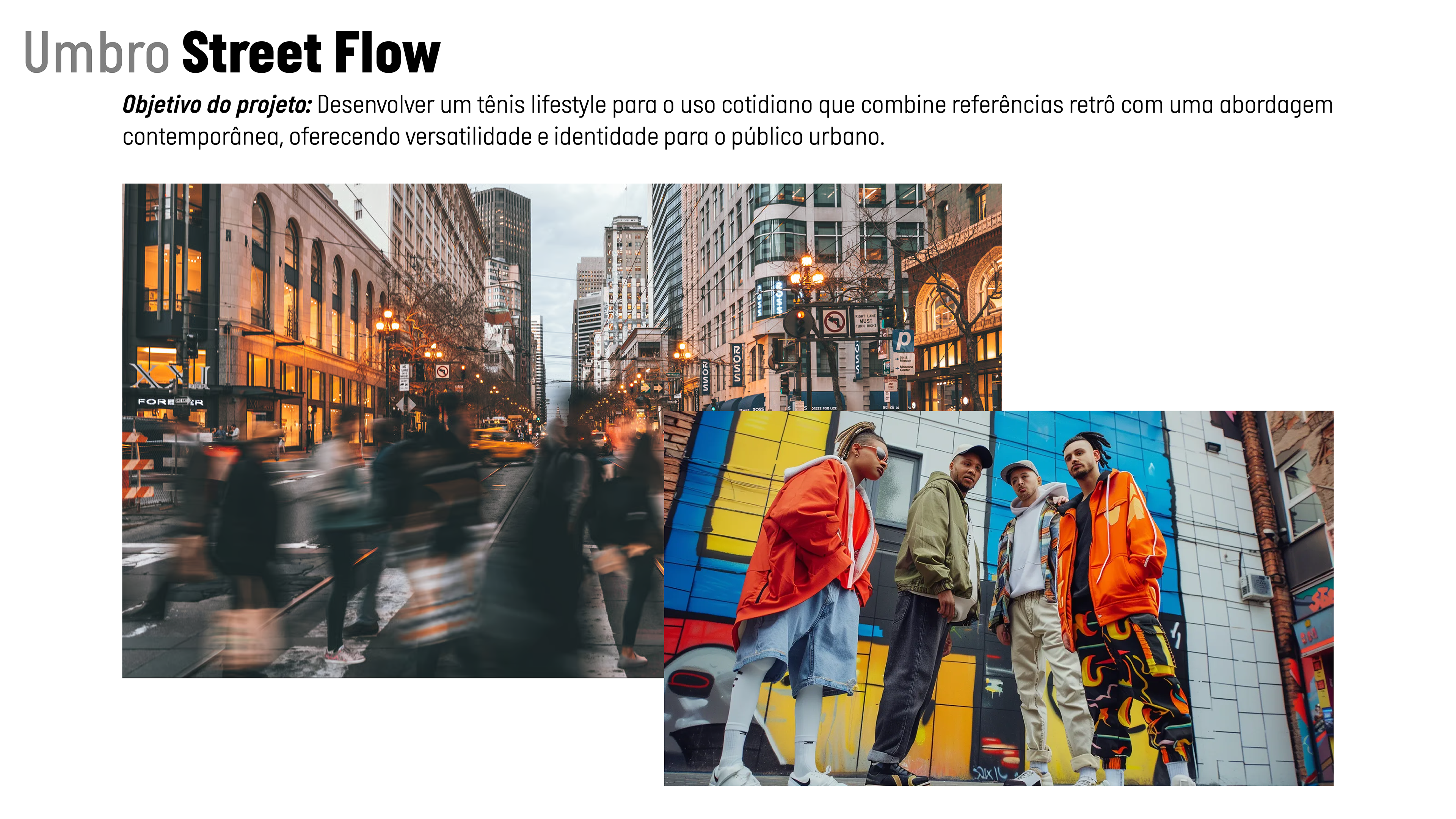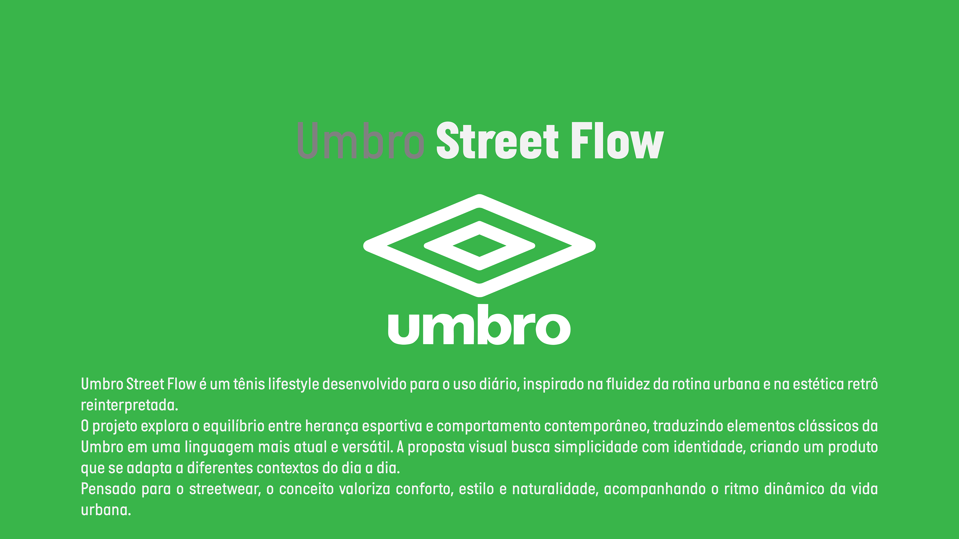 Umbro Street Flow é um tênis lifestyle desenvolvido para o uso diário, inspirado na fluidez da rotina urbana e na estética retrô reinterpretada. O projeto explora o equilíbrio entre herança esportiva e comportamento contemporâneo, traduzindo elementos clássicos da Umbro em uma linguagem mais atual e versátil. A proposta visual busca simplicidade com identidade, criando um produto que se adapta a diferentes contextos do dia a dia. Pensado para o streetwear, o conceito valoriza conforto, estilo e naturalidade, acompanhando o ritmo dinâmico da vida urbana.